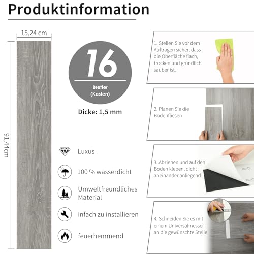 Specification: MULGREAT Vinyl-vloerbedekking, zelfklevende planken, pvc-vloerbedekking, zelfklevend, duurzame houtnerf, planken voor slaapkamer, keuken, woonkamer, dikte 1,5 mm, 2,23 m²/16 planken